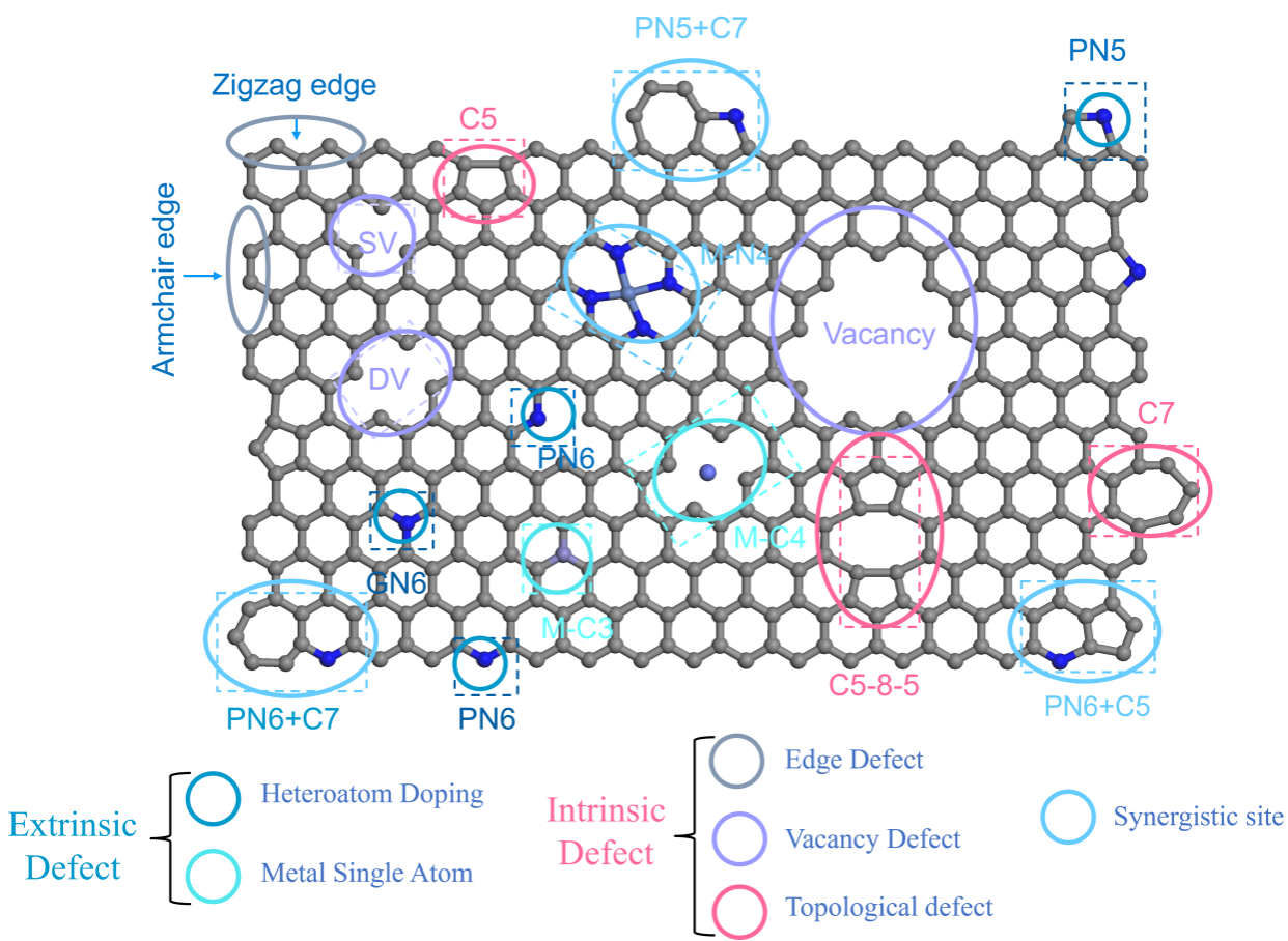 拓扑缺陷作为碳材料中由非六元环(如五元环、七元环等)构成的本征结构,能够显著调控碳基催化材料的电子结构与表面化学性质,从而加速其在氧还原反应(ORR)、氢析出反应(HER)、氧析出反应(OER)以及二氧化碳还原反应(CO₂RR)等关键能源转换反应的动力学。本文首次从“合成—结构—性能”的整体视角,系统归纳了原子脱除、等离子体刻蚀、化学氧化/刻蚀、球磨法、模板法等多种拓扑缺陷碳构建策略,深入探究了先进表征技术在缺陷识别与电子结构解析中的应用,并结合理论计算揭示了拓扑缺陷碳调控反应中间体的吸附行为。该论文不仅论证了拓扑缺陷碳作为本征活性中心的作用,还进一步揭示了其在锚定和调控金属单原子/团簇等活性物种电子结构中的重要功能,为设计高性能杂化催化材料提供了新思路。