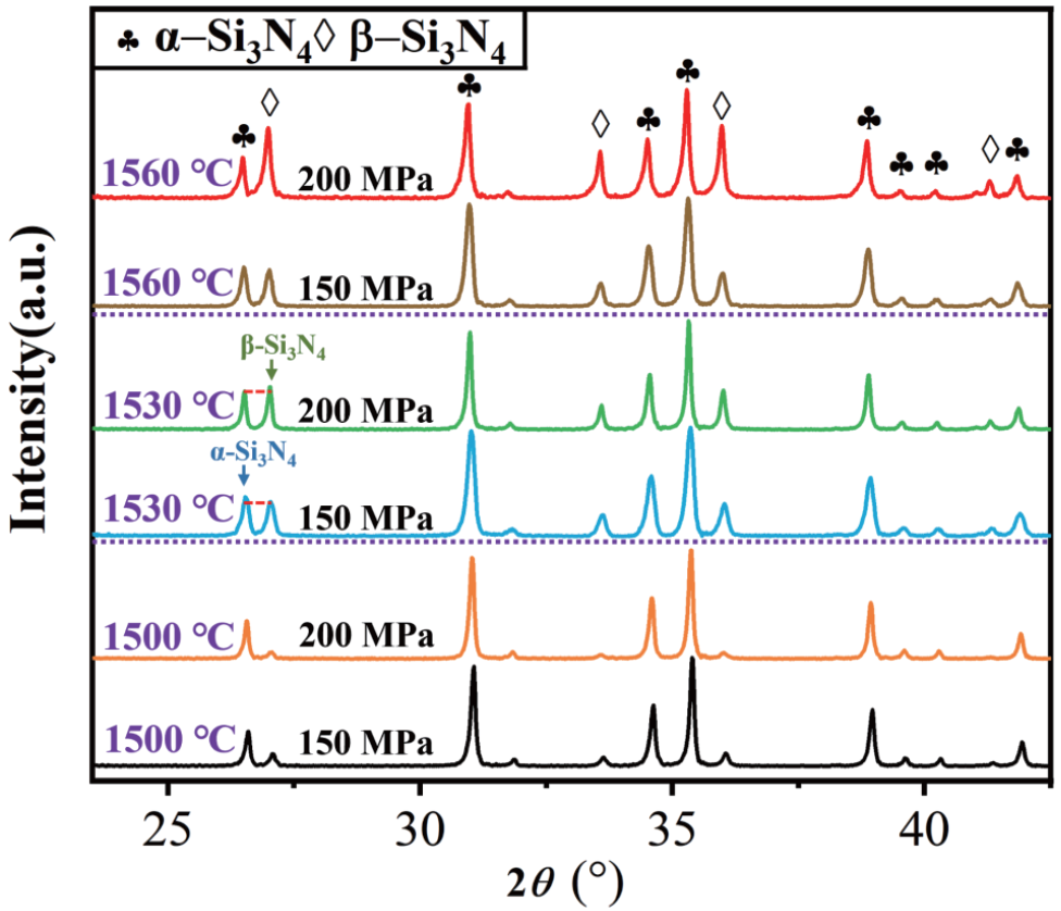 氮化硅(Si3N4)在致密化前发生的α→β相变是制约兼具高硬度与高韧性双相微结构形成的根本性挑战。虽然高压的引入可降低致密化温度并避免完全相变,但在压力作用下液相会促进颗粒旋转导致晶粒粗化,最终阻碍细晶结构的形成。