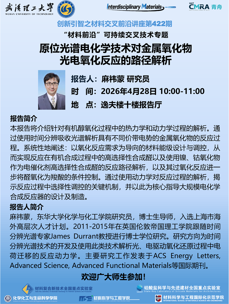 创新引智之材料交叉前沿讲座第422期:原位光谱电化学技术对金属氧化物光电氧化反应的路径解析